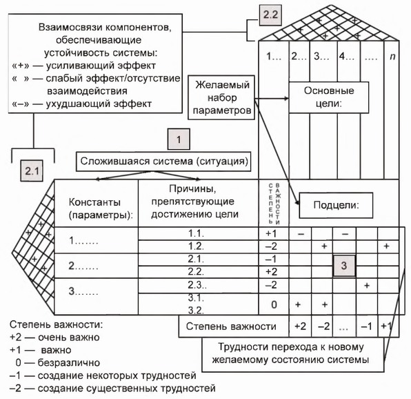 Этап 3 — Определение переходных взаимодействий. На третьем этапе строится базовая матрица переходного состояния (3), объединяющая горизонтальную и вертикальную матрицы. Базовая матрица переходного состояния помогает определить степень трудности перехода от существующего состояния системы к желаемому (требуемому) состоянию. Практическое значение третьей матрицы состоит в том, что она показывает характер взаимодействия существующих и перспективных констант в процессе перехода от существующих параметров системы — к новым. Как видно на рис. 11.9, большинство гипотетически предполагаемых переходов от существующих констант к желаемым характеристикам противоречат друг другу.