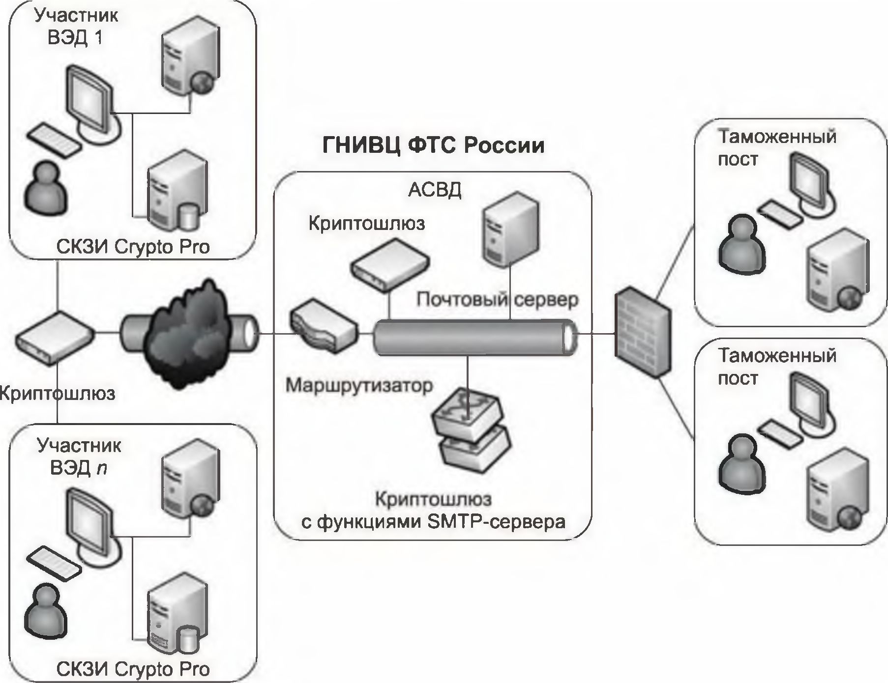 • для обеспечения целостности и юридической значимости передаваемой информации в процессе информационного взаимодействия должны использоваться сертифицированные ФСБ России средства криптографической защиты информации и электронной цифровой подписи, совместимые с системой ведомственных удостоверяющих центров таможенных органов (далее — СВУЦТО);