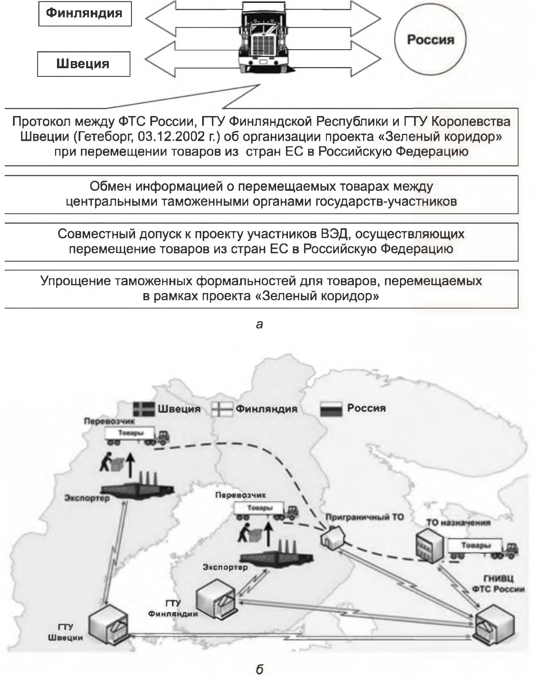 Технические аспекты информационного взаимодействия на Российской стороне обеспечивает автоматизированная система «Зеленый коридор». Основу информационного взаимодействия таможенных служб создают «Технические условия электронного обмена данными при перемещении через границу товаров и транспортных средств из Республики Финляндия, Королевства Швеция в Российскую Федерацию».