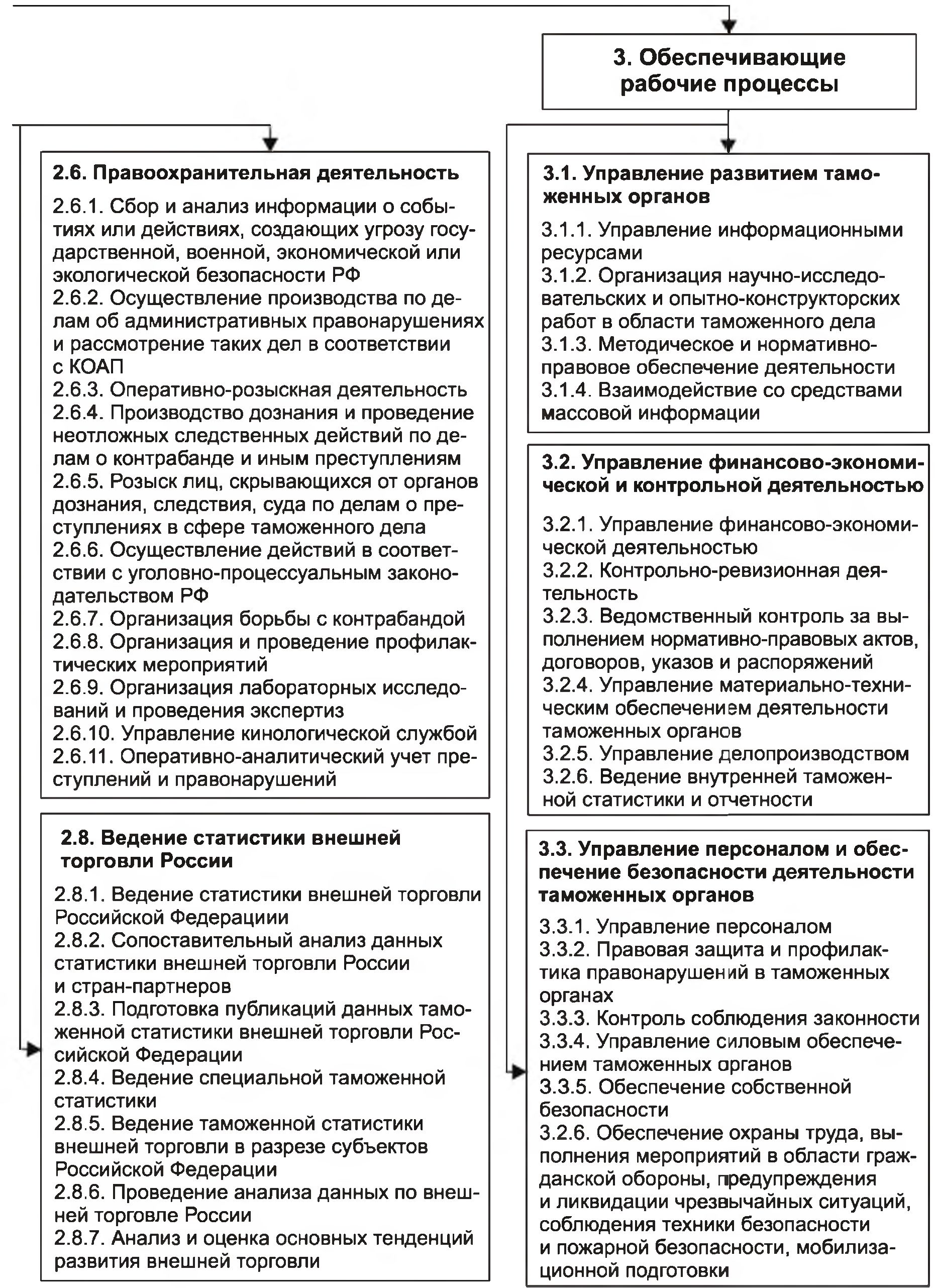 В группу обеспечивающих процессов включены процессы, которые являются межфункциональными и поддерживают как стратегические, так и операционные процессы. Некоторые из них специфичны для таможенных органов России, но большинство обеспечивающих процессов аналогичны для всех государственных органов.