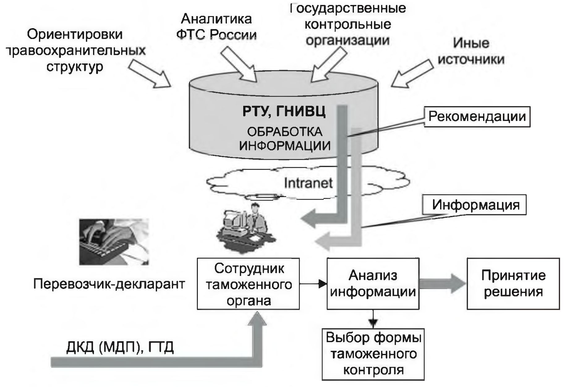 Доступ к ЦБД опосредован промежуточными Intel-серверами. Современные операционные системы позволяют непосредственно работать с массивами информации, что предопределяет возможность несанкционированного доступа к хранящейся информации. Поэтому в ФТС России, прежде всего, формализована специфика работы каждого таможенного подразделения, и должностные лица могут работать только с определенными полями таможенных деклараций в соответствии со своими задачами. Например, управление контроля таможенной стоимости работает с полями «Стоимость», «Вес нетто», «Вес брутто», а также с количеством наименований товаров. При этом сведения, которые запрашивает пользователь, выгружаются на промежуточный сервер, и обратного хода нет. Таким образом, исходная информация ЦБД развязана с теми данными, которые обрабатываются в повседневной деятельности.
