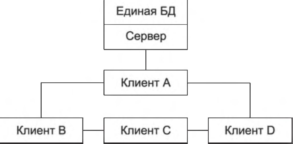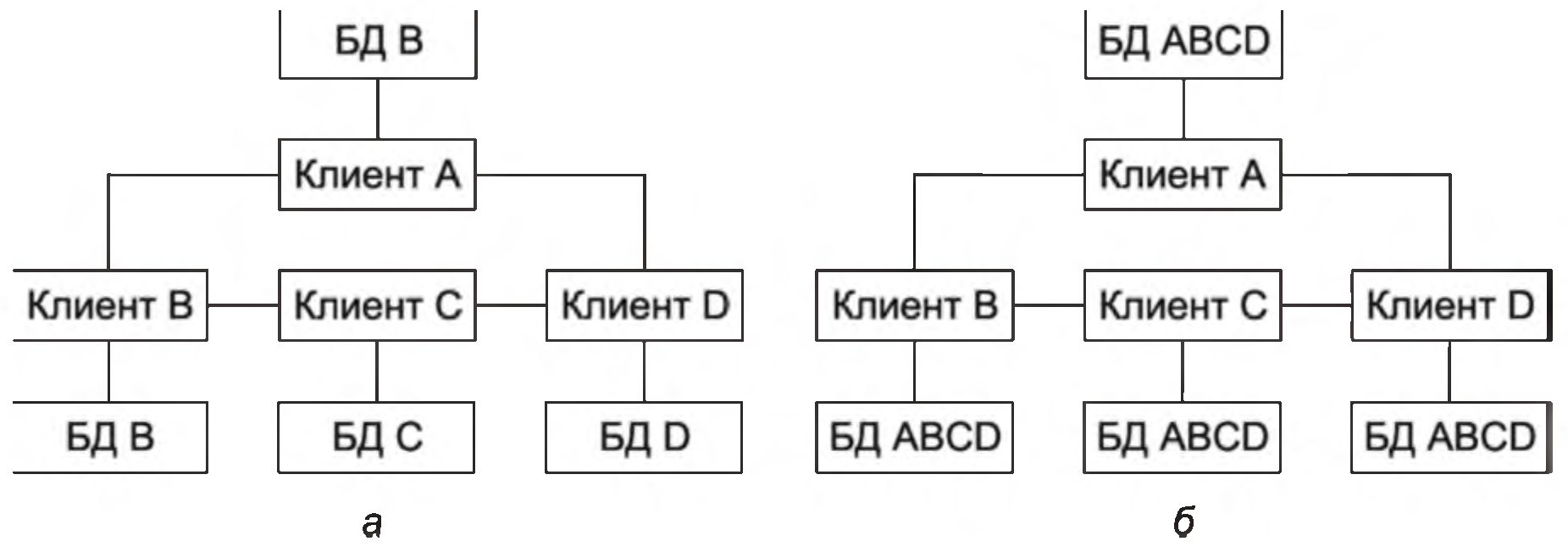 Децентрализованная организация данных предполагает разбиение информационной базы на несколько физически распределенных. Каждый клиент пользуется своей базой данных, которая может быть либо частью общей информационной базы (рис. 41, а), либо копией информационной базы в целом (рис. 41, б), что приводит к ее дублированию для каждого клиента.