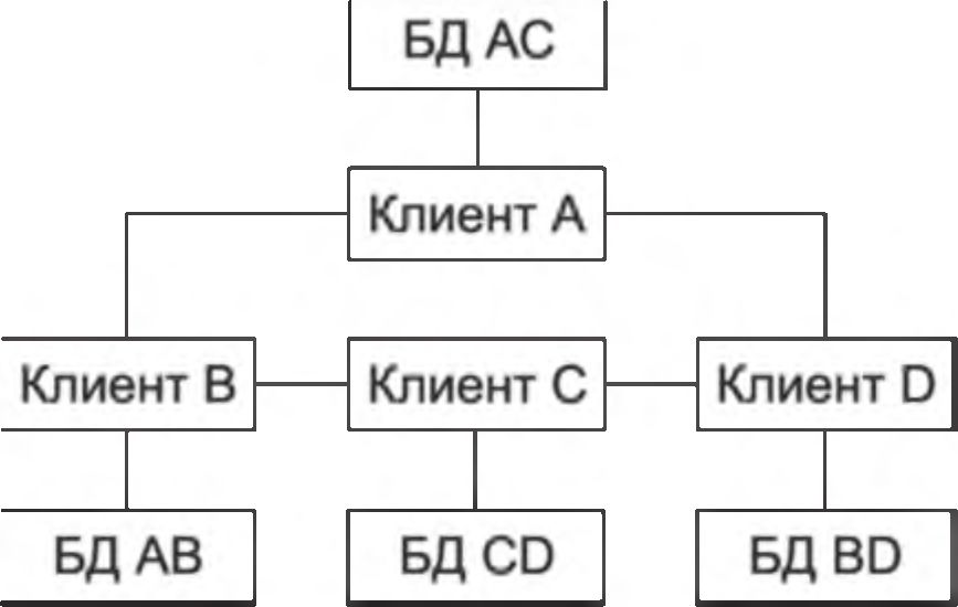 5. Технология «клиент-сервер», ориентированная на изменение данных в нескольких местах. В отличие от предыдущей технологии здесь имеется сервер-координатор, поддерживающий протокол передачи данных между различными серверами. Возможна обработка распределенных транзакций в разных удаленных серверах. Это создает предпосылки разработки распределенной СУБД. Реализуется стратегия смешанного распределения путем передачи копий с помощью СУБД.