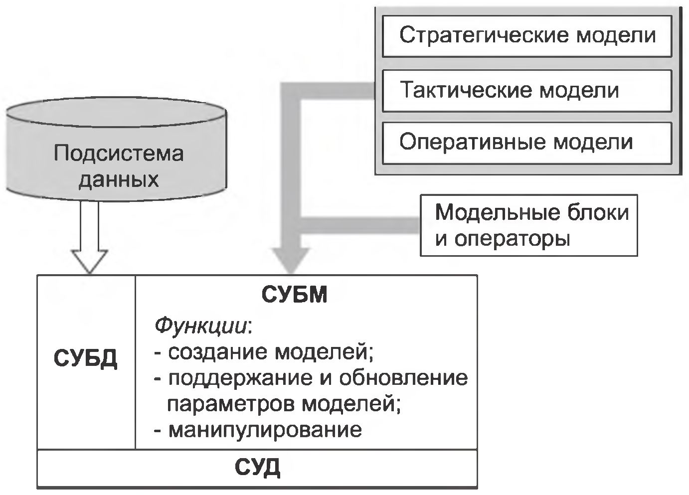 Представление о структуре СППР можно составить из рассмотрения рис. 43. В состав СППР помимо пользователя входят три главных компонента: подсистема обработки и хранения данных, подсистема хранения и использования моделей и программная поддержка. Последняя включает в себя систему управления базой данных (СУБД), систему управления базой моделей (СУБД) и систему управления диалогом между пользователем и компьютером (СУД).