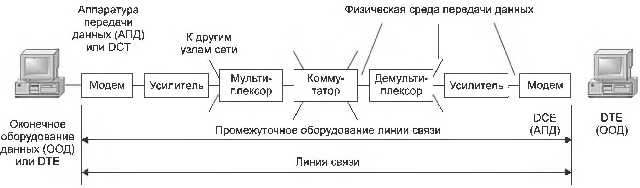 Аппаратура пользователя линии связи, вырабатывающая данные для передачи по линии связи и подключаемая непосредственно к аппаратуре передачи данных, обобщенно носит название оконечное оборудование данных (ООДили DTE — Data terminal Equipment). Примером DTE могут служить компьютеры или маршрутизаторы локальных сетей. Эту аппаратуру не включают в состав линии связи.