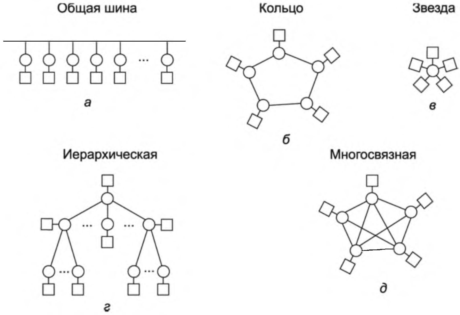 Рис. 61. Основные типы структур сетей ЭВМ: □ — компьютер: ○ — узел коммутации