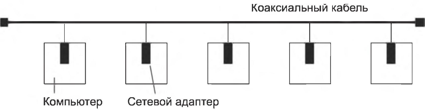В стандарте Ethernet строго зафиксирована топология электрических связей. Компьютеры подключаются к разделяемой среде в соответствии с типовой структурой «общая шина» (рис. 64).