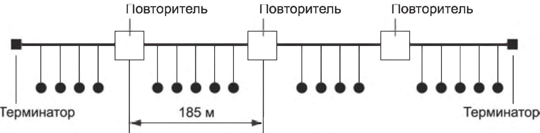 Рис. 65. Повторитель позволяет увеличить длину сети Ethernet