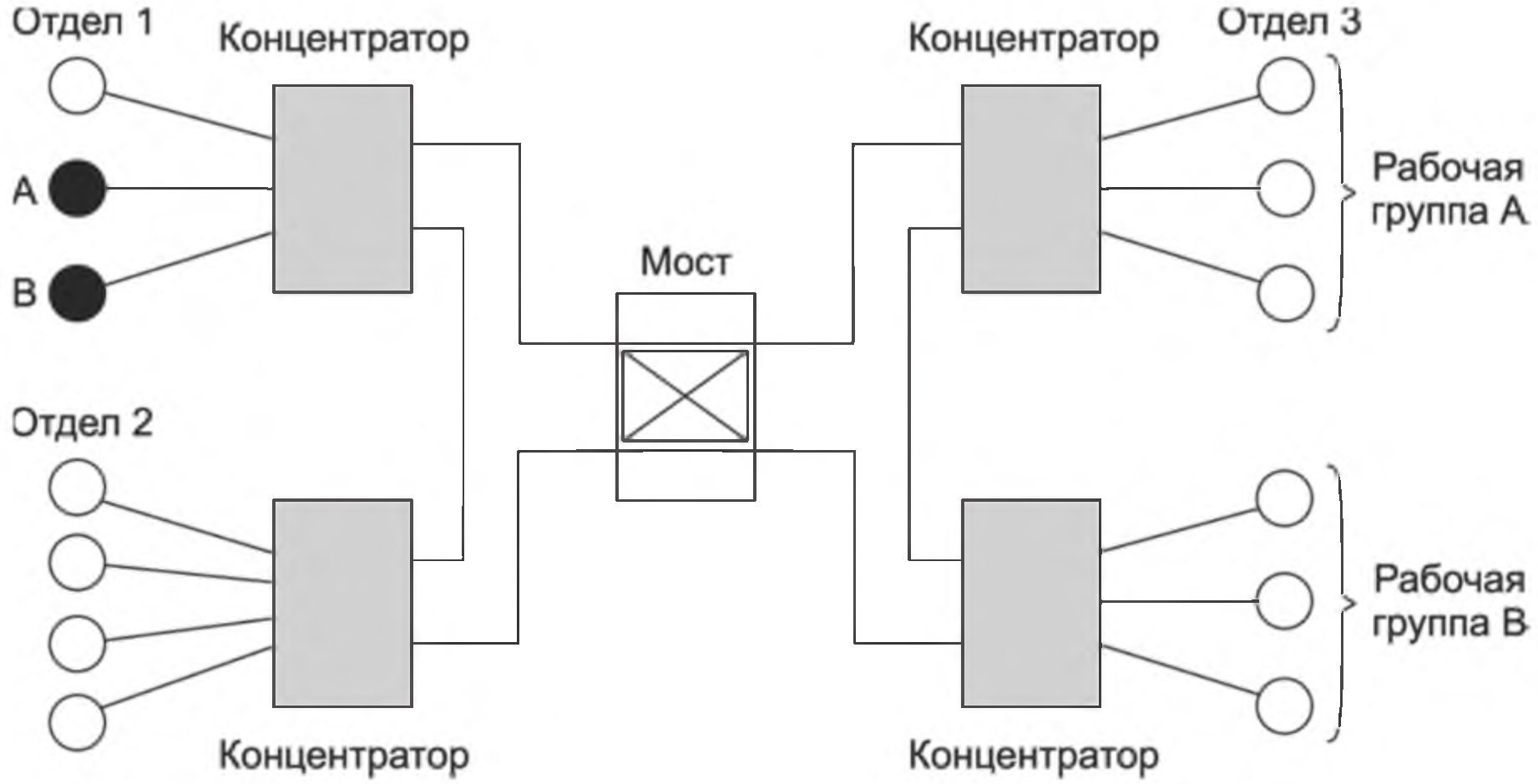 Нетрудно заметить, что в предложенном решении отказались от идеи общей разделяемой среды в пределах всей сети, хотя и оставили ее в пределах каждого отдела. Пропускная способность линий связи между отделами не должна совпадать с пропускной способностью среды внутри отделов. Если трафик между отделами составляет только 20% трафика внутри отдела (как уже отмечалось, эта величина может быть другой), то и пропускная способность линий связи и коммуникационного оборудования, соединяющего отделы, может быть значительно ниже внутреннего трафика сети отдела.