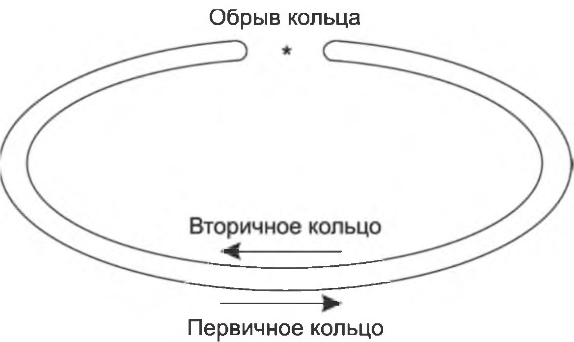 В случае какого-либо вида отказа, когда часть первичного кольца не может передавать данные (например, обрыв кабеля или отказ узла), первичное кольцо объединяется со вторичным (рис. 69), вновь образуя единое кольцо. Этот режим работы сети называется Wrap, т. е. «свертывание» или «сворачивание» колец.