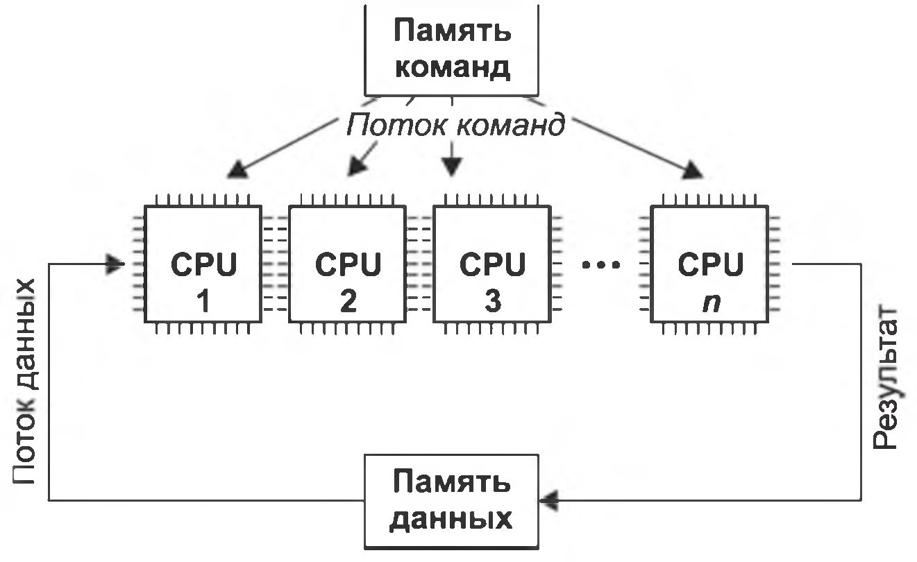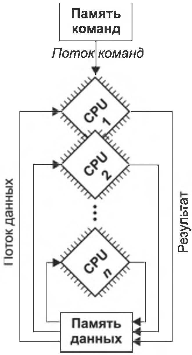 Процессоры образуют конвейер, на вход которого одинарный поток данных доставляет операнды из памяти. Каждый процессор обрабатывает соответствующую часть задачи, передавая результаты соответствующему процессору, который использует их в качестве исходных данных. Таким образом, решение задач для некоторых исходных данных развертывается последовательно в конвейерной цепочке. Это обеспечивает подведение к каждому процессору своего потока команд, т. е. имеется множественный поток команд. Структура МКМД (много потоков команд, много потоков данных) представлена на рис. 8.