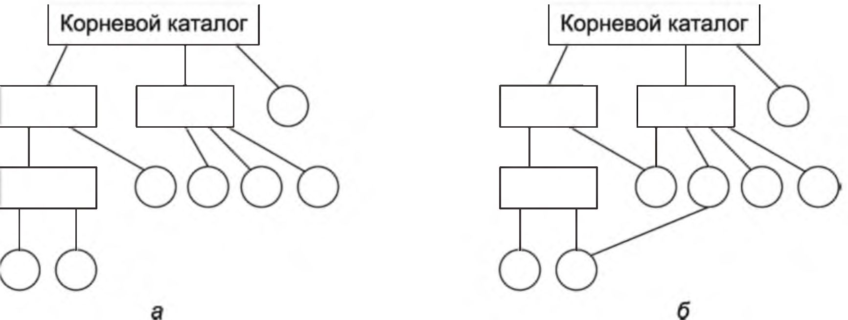 Рис. 12. Структура файловых систем: а — иерархическая; б — сетевая