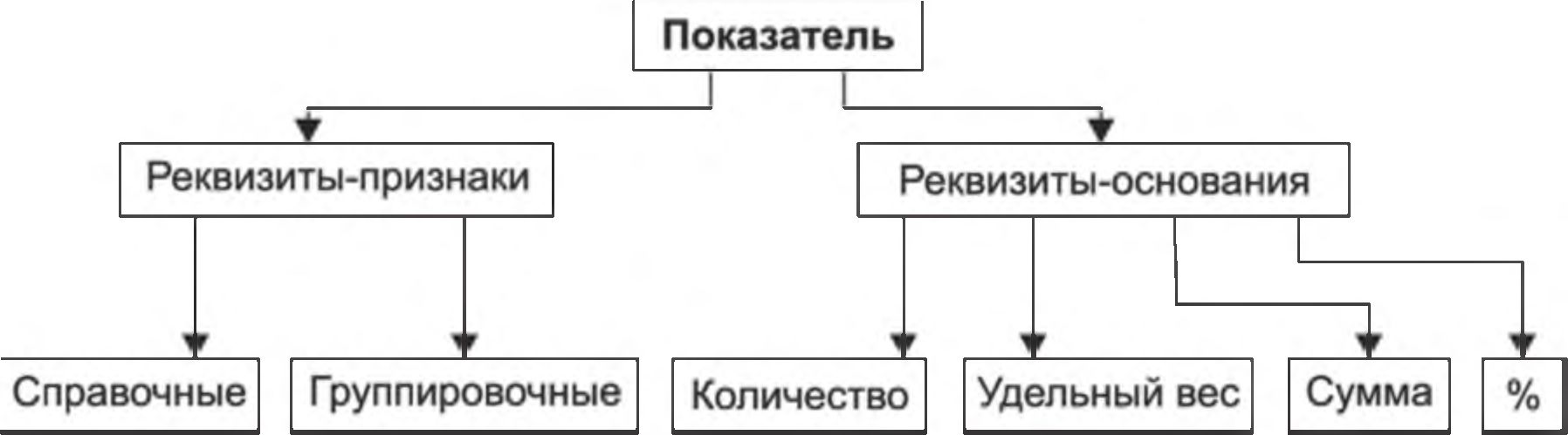 Реквизиты-основания подразделяются по типу алгоритмов их получения на количественные, стоимостные, проценты, удельные веса и пр. Множество реквизитов-признаков по степени формализации делится на два подмножества: