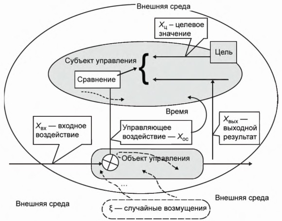 Рис. 16.1. Принципиальная схема управления, отражающая условия возникновения фактора риска — возмущений ξ (внешних и внутренних)