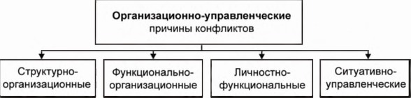 Структурно-организационные причины конфликта заключаются в несоответствии структуры организации требованиям деятельности, которой она занимается. Функционально-организационные причины конфликта порождаются неточностью функциональных связей организации с внешней средой, между структурными элементами организации, между отдельными работниками. Личностно-функциональные причины конфликта связаны с неполным соответствием работника по профессиональным. нравственным и другим качествам требованиям занимаемой должности. Ситуативно-управленческие причины конфликтов обусловлены ошибками, допускаемыми руководителями и подчиненными в процессе решения служебных задач.
