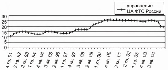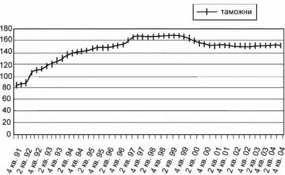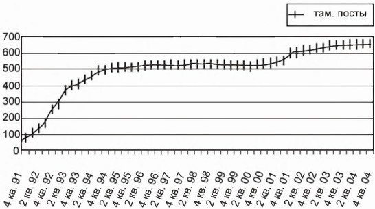 Количественные изменения в составе таможенных органов исследовались на интервале с 1991 по 2004 г. Интервал представлен поквартально. Результаты показаны на соответствующих графиках (рис. 6.1—6.3).