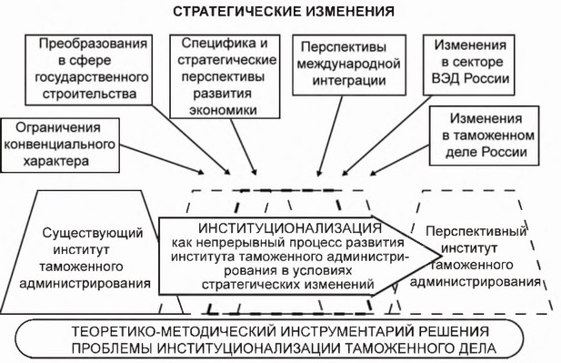 Указанные факторы и детерминанты в совокупности формируют определенную конфигурацию институционального пространства стратегических изменений таможенных органов, которое также находится в постоянной динамике. Представленный характер процесса стратегических изменений вызывает необходимость постоянных преобразований в таможенном деле. По сути, речь идет о постоянных институциональных изменениях или об институционализации как непрерывном процессе развития таможенных органов.