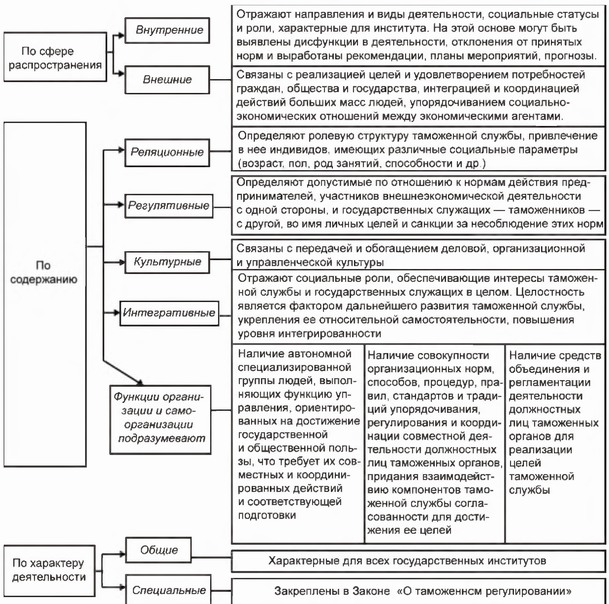 • по содержанию — регулятивная, культурная, интегративная, а также функции организации и самоорганизации (важно отметить, что организационная функция таможенной службы распространяется на саму таможенную службу, но целесообразно также подчеркнуть и внешний аспект данной проблемы — организационную роль таможенной службы как государственного института в обществе, в государстве в целом и в сфере внешнеэкономической и таможенной деятельности в частности);