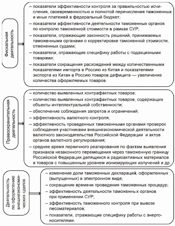 Действующая в настоящее время система показателей деятельности таможенных органов введена Приказом ФТС России от 12.01.2006 г. № 5. «O контрольных показателях эффективности деятельности региональных таможенных управлений и таможен, непосредственно подчиненных ФТС России, на 2006 год». В Приказе ФТС от 02.03.2007 г. № 250 «О контрольных показателях эффективности деятельности региональных таможенных управлений и таможен, непосредственно подчиненных ФТС России, на 2007 год» в список показателей были внесены некоторые изменения и дополнения. В частности, были добавлены показатели: «количество выявленных контрафактных товаров, содержащих объекты интеллектуальной собственности»; «обеспечение соблюдения запретов и ограничений, не носящих экономического характера»; «эффективность проведенных таможенными органами проверок соблюдения участниками внешнеэкономической деятельности валютного законодательства Российской Федерации и актов органов валютного регулирования»; «повышение степени информатизации и информационной открытости таможенных органов Российской Федерации»; «среднее время реагирования по фактам выявления признаков незаконного перемещения через таможенную границу Российской Федерации делящихся и радиоактивных материалов и товаров с повышенным уровнем ионизирующих излучений».