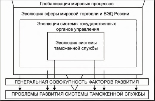 Проблемы развития института таможенной службы, как и любой другой большой сложной социально-экономической системы, определяются генеральной совокупностью факторов развития, их согласованностью и направленностью.
