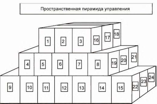 Такой прием позволяет перейти от плоской пирамиды управления к более детальной и алгоритмизированной — пространственной. В результате пространственная пирамида управления (рис. 13.3) содержит 45 ячеек, полностью охватывающих все этапы управления любым видом деятельности.