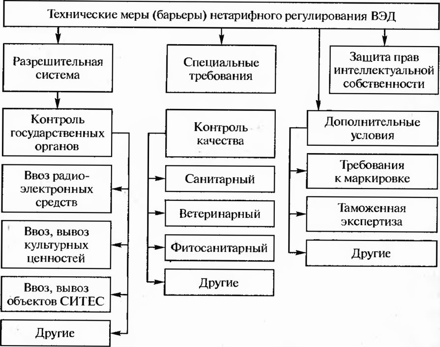 Под техническими мерами (барьерами) следует понимать такие НТО, которые основаны на соблюдении национальных требований к техническим характеристикам товаров, специальных требований к качеству товаров, их соответствии санитарным, фитосанитарным и ветеринарным требованиям, системам сертификации и др. Понятие технических барьеров оправданно дополнить требованием по соблюдению прав интеллектуальной собственности.