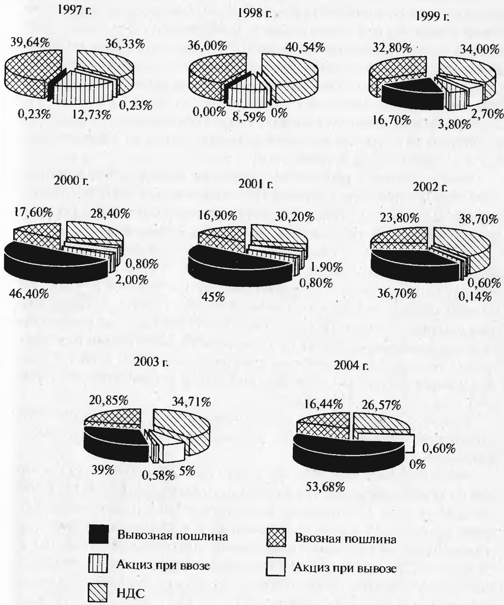 Рис. 11.2. Структура устанавливаемых плановых заданий по формированию доходной части федерального бюджета в 1997—2004 гг.