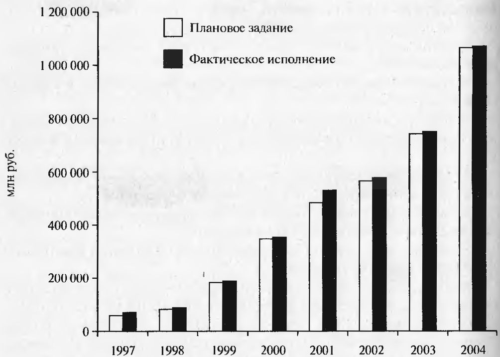 На рис. 11.1 приведена динамика исполнения федерального бюджета в 1997—2004 гг., а на рис. 11.2 — структура устанавливаемых плановых заданий по формированию доходной части федерального бюджета в 1997-2004 гг.