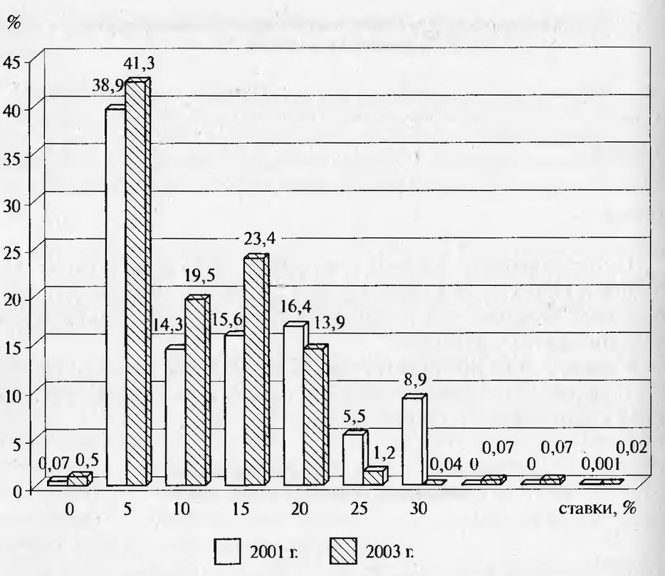 Основной ставкой российского таможенного тарифа в настоящее время является ставка 5%, которая сегодня составляет 41,3% общих ставок. Второй по частоте встречаемости (23,4%) является ставка тарифа 15%, и третьей — ставка тарифа 10%, которая встречается в 19,5% случаев. Сравнивая тарифы 2001 г. и 2002 г. видим, что происходит «стягивание» тарифа в зону 5—15% за счет уменьшения ставок 20—30%.